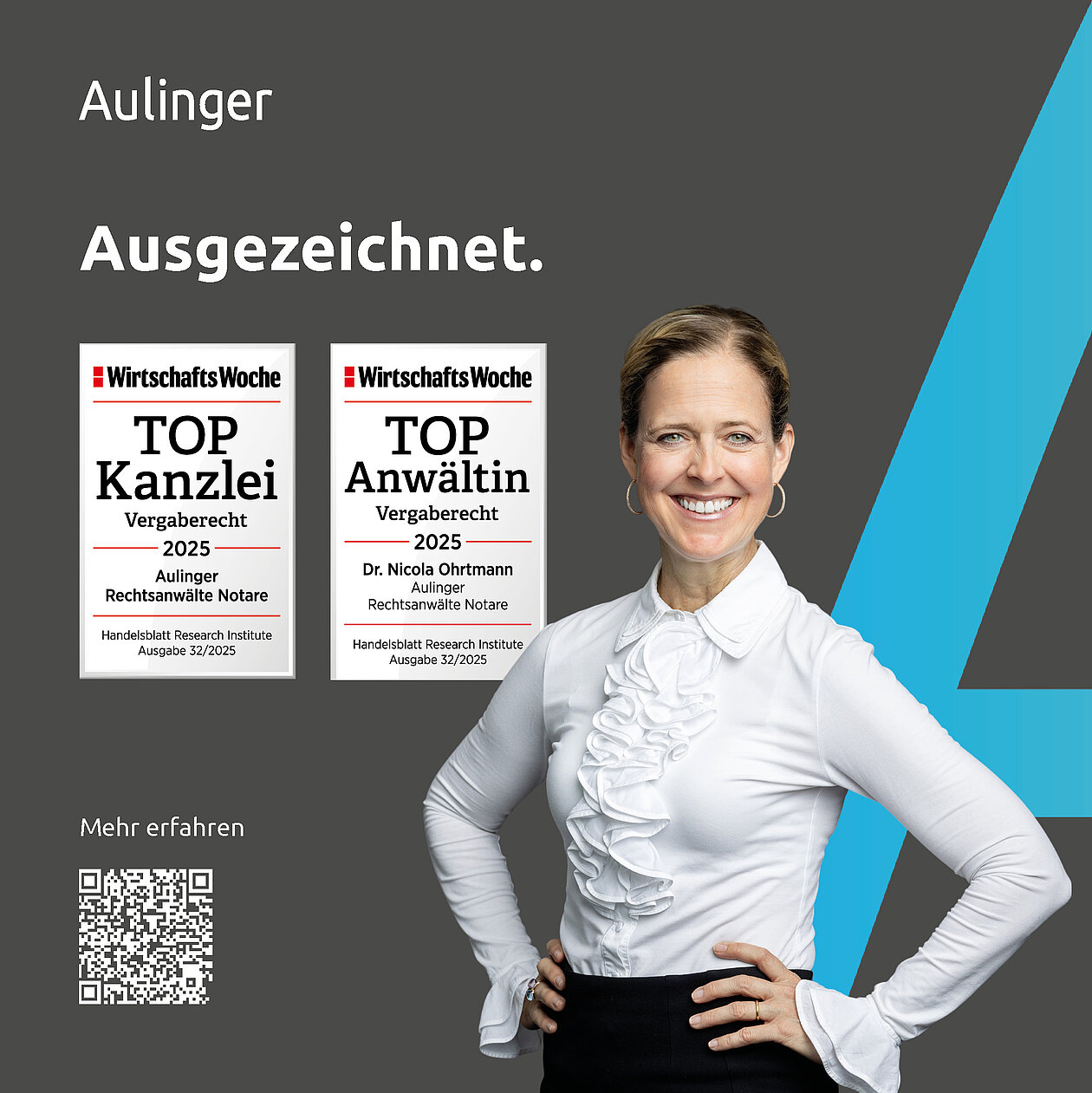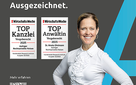 Seit acht Jahren prämiert die Wirtschaftswoche jährlich die TOP Kanzleien und TOP Anwälte im Vergaberecht. Seit acht Jahren ist Aulinger als TOP Kanzlei im Vergaberecht mit dabei, zusammen mit unserer ebenfalls seit acht Jahren als TOP Anwältin im Vergaberecht platzierten Partnerin Dr. Nicola Ohrtmann. So auch in diesem Jahr: